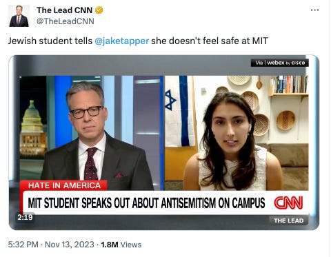 On November 13th, Jake Tapper interviewed an MIT graduate student about supposed antisemitism under the sensationalist chyron of “Hate In America.”