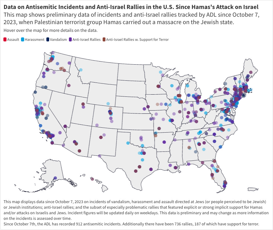 Unfortunately, the ADL’s latest report continues this smoke-and-mirrors tactic. As examples of “antisemitic incidents,” the ADL cites a pro-Israel protestor being called a “Fucking Zionist,” unconfirmed reports of harassment between pro-Palestine and pro-Israel protestors, and a bizarre accusation of “a car with Palestine flags appearing to intentionally swerve, nearly hitting a visibly Jewish family.” Calling someone a “Fucking Zionist” may be rude, but it’s not anti-semitic. “Alleged” assaults are not actual assaults, especially in cases where exactly what happened is unclear. For example, many pro-Israel media figures accused Palestine supporters of killing a Jewish man in Thousand Oaks, California, only for it to be later reported that the man died due to a head injury he sustained during an accidental fall. The claim about the car appears to be unreported anywhere else, as no trace of it exists online (if you have a video of the incident, please send it to me!). The ADL also uses the phrase “appearing to intentionally swerve,” implying an intent to harm that it can’t possibly corroborate. The ADL has also mapped “anti-Israel rallies” alongside antisemitic assaults, implying there is a connection between peacefully criticizing the nation of Israel and assaulting someone because they are Jewish.