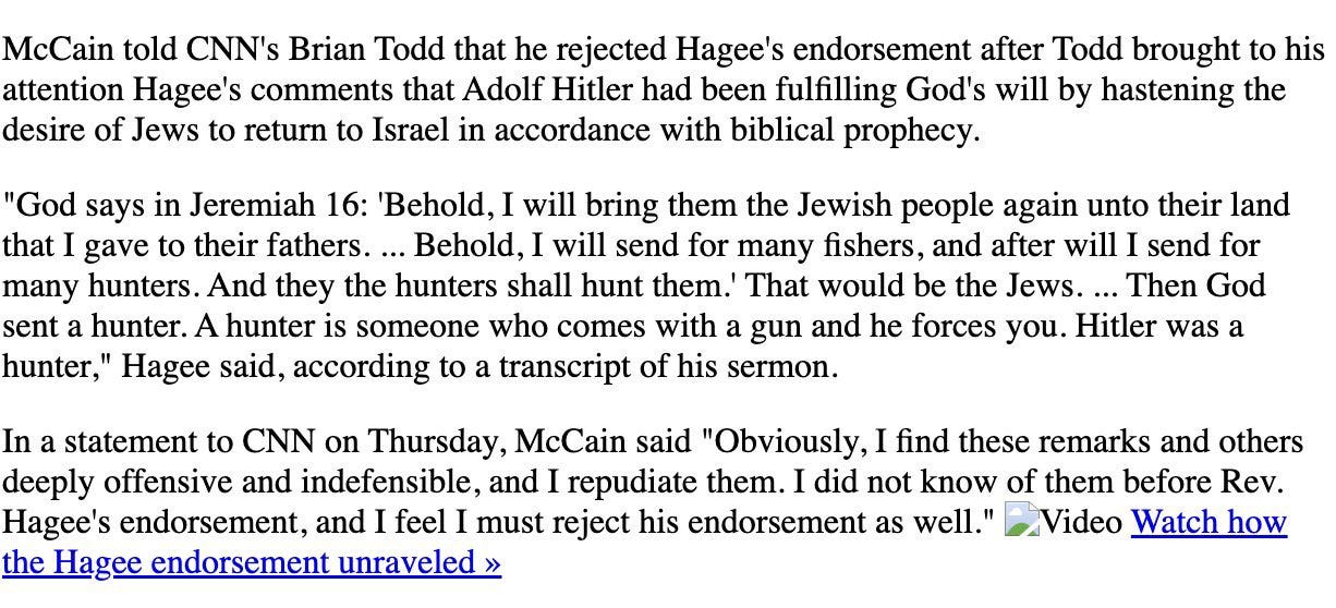 For example, I’m writing this on November 14th, as the “March for Israel” rally is held in Washington D.C. One scheduled speaker is Pastor John Hagee, a known antisemite who claimed Hitler was sent by God. I can’t believe I have to say this, but if you think saying “Free Palestine” is antisemitic while praising the architect of the Holocaust is not, your moral compass is in dire need of repair.
