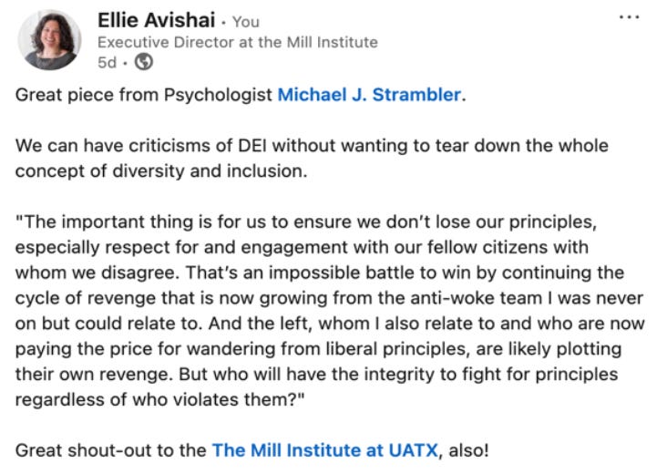 But just a little over a year after opening, Fascist Hogwarts is in turmoil. Nearly 60% of the University of Austin’s thirty-four-person staff has left. One staff member was pushed out after she posted the below on LinkedIn, violating the right’s purity test by admitting that some diversity initiatives held merit.