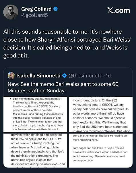 While the above developments were flashing warning signs that Weiss’s project was coming off the rails, the inevitable explosion came last weekend when the CBS Editor in Chief cancelled a highly-publicized 60 Minutes segment interviewing survivors from CECOT: the infamous Salvadorian concentration camp where Trump has imprisoned migrants. After days of extensive advertising and social media promotion, Weiss pulled the piece just three hours before airtime; an unusual move for any program, never mind one as sacred to the American mind as 60 Minutes. Among serious commentators, there’s no doubt Bari Weiss spiked the segment to protect the Trump administration. Following an interview with Republican dissident Marjorie Taylor Greene a few weeks ago, Trump fumed at 60 Minutes on Truth Social, prompting Bari Weiss to step in and assert more control over the show’s “political” content.