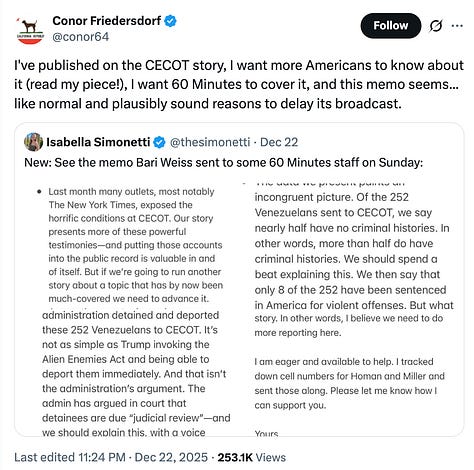 This article was originally published on December 19th. A day later, Bari Weiss cancelled 60 Minutes’ highly anticipated episode interviewing CECOT survivors to protect the Trump Administration from bad press. As this is the most egregious and blatant corporate-state censorship in recent memory, this version is updated to detail how Weiss’s sycophantic ‘journalism’ for the rich and powerful risks blowing up what little cultural relevancy the conservative project has left.