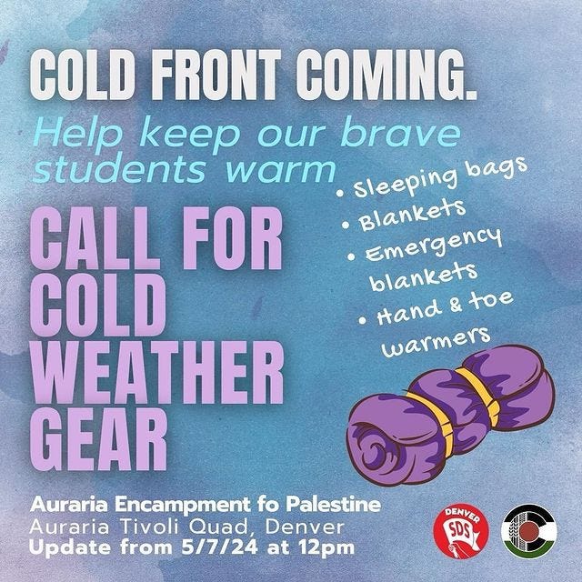 Already, pro-Palestine student protestors are focusing on their legacy. They’ve connected their movements with past social justice initiatives, such as the Civil Rights, Anti-Vietnam War, and Anti-Apartheid struggles. “Peoples’ libraries” filled with revolutionary literature are helping students see how their actions connect with the global liberation struggle. At our local encampment here in Denver, civil rights legend Angela Davis stopped by to share words of encouragement. Later that week, students were trained by local labor organizers on how to unionize their workplaces.