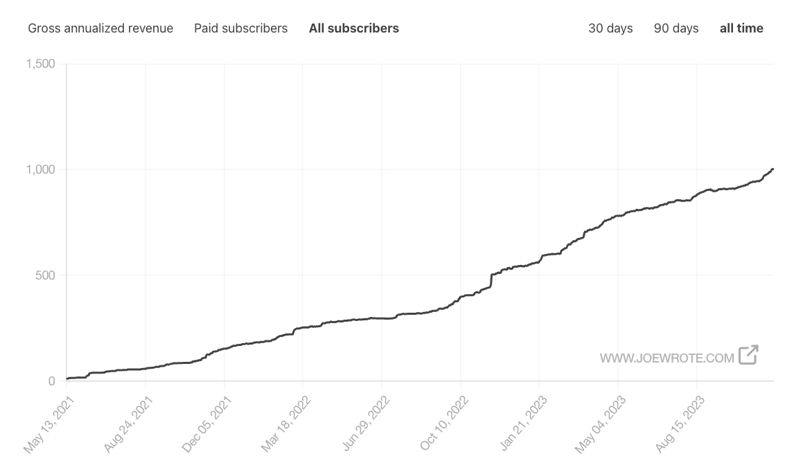 I started JoeWrote a few years ago, but it wasn’t until I lost my job last fall that I began publishing twice a week. Since then, the results have been better than I imagined. My goal for 2023 was to get 1,000 free subscribers by the end of the year. I’m happy to report we crossed that threshold last week!