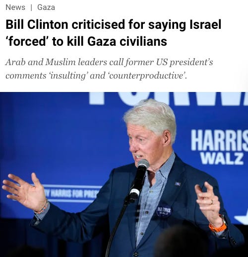 Much like on economics, the Harris campaign went out of its way to ignore the flashing red warning lights that supporting Israel’s genocide would cost votes. When door-to-door canvassers reported voters were bringing up Gaza, the campaign told them to mark all Palestine-related concerns as “no response” in feedback surveys.10 As Harris has since admitted to in her book, 107 Days, the ‘Gaza issue’ was a political liability for Democrats that cost them younger, more progressive voters. Centrists didn’t “miss” the voters concerned about Gaza — they actively plugged their ears and shouted “Nah Nah I can’t hear you!” because they found criticizing Israel personally discomforting. Instead of expanding the tent by criticizing Israel, the campaign sent Bill Fucking Clinton to Michigan (which has the highest Arab-American percentage population) days before the election to rant about how Palestine is actually Judea and Samaria and dead Gazans had it coming. Three days later, Trump won Michigan by less than 2%. Good job, dipshits.