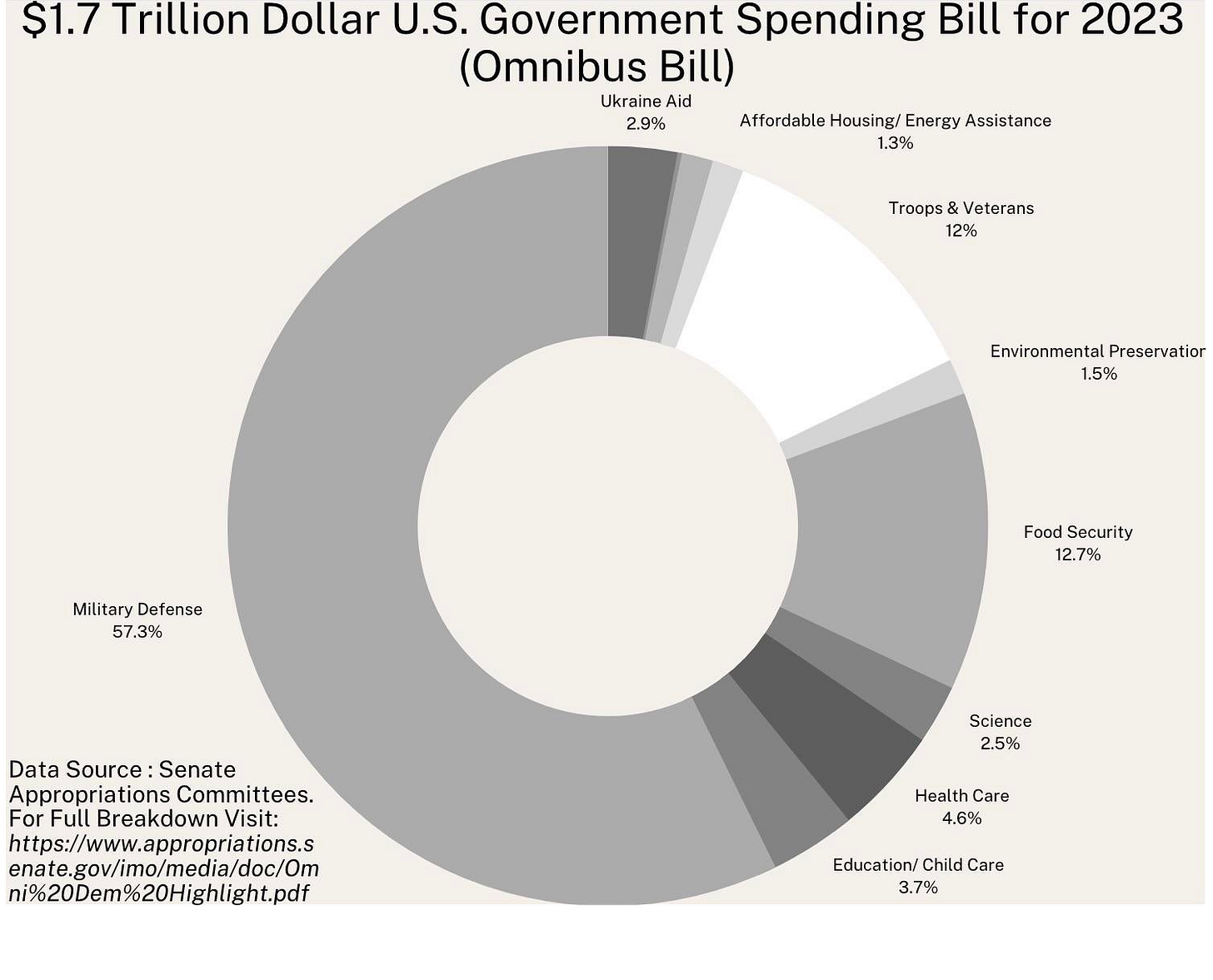 It’s actually 6 defense contractors in a trench coat, as made evident by Congress’s 2023 budget, a.k.a. the “Omnibus Bill.” This is the process by which Congress sets the year’s discretionary spending. Discretionary spending is money Congress chooses to spend, as opposed to mandatory spending which has already by promised, mostly to Medicare, Medicaid, and Social Security. Though Congress always has the option, changing mandatory spending is a lengthy and tedious process that carries severe political risk (see Bush’s attempt to privatize Social Security). On the other hand, discretionary spending is set through Congressional legislation, making it a good way to understand the priorities of our elected officials.