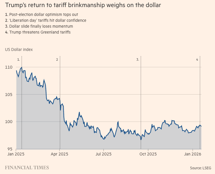 Traditionally, war, conflict, famine, and other geopolitical shocks have led to increased investment in American assets. When the ground starts to shake, international investors turn towards the ever-predictable U.S. dollar and government bonds, driving up their value. Over the weekend, Trump threatened to tariff European nations that deployed troops to Greenland to deter his potential invasion. The threatened nations responded by preparing a tariff package worth $108B. With another global trade war looming (or rather, an increased intensity of the one we’re already in), it’s no surprise the U.S. dollar dropped .9% when the markets opened on Tuesday. (They were closed on MLK Day.) This continues the dollar’s devaluation slide driven by Trump’s second term, which has decreased the currency’s value by approximately 10%. Other stocks also fell, pushing the S&P 500 to its worst drop since October.