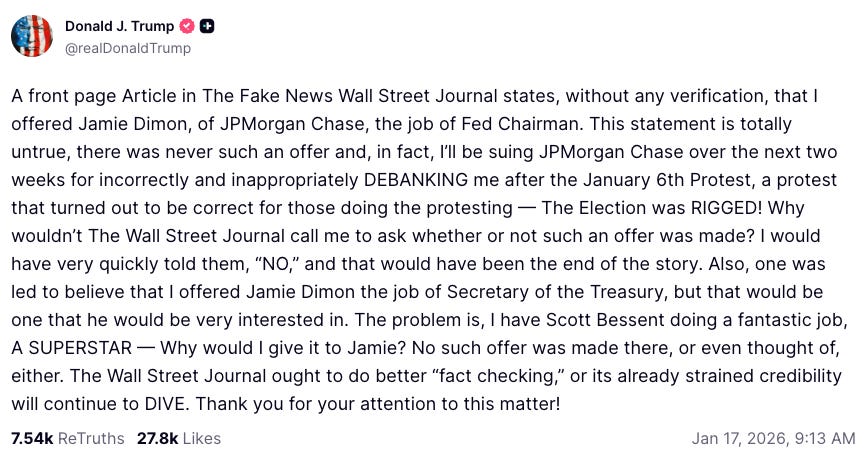 After JPMorgan Chase CEO Jamie Dimon publicly supported Jerome Powell and criticized Trump’s attempts to strip the Federal Reserve of its independence, Trump threatened to sue JPMorgan Chase for allegedly debanking him after the January 6th insurrection. (The conservative obsession with “debanking” is a whole other rabbit hole for another time.)