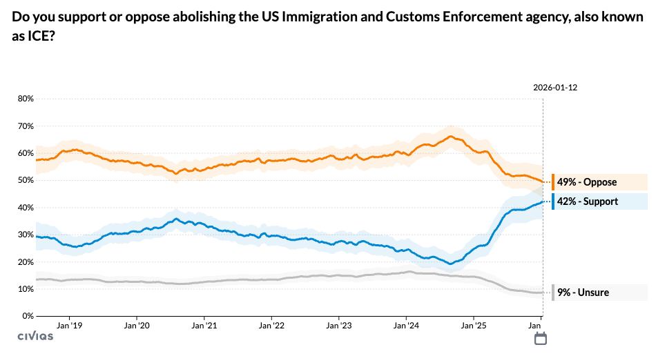 Last week, Civiqs found 50% of voters oppose abolishing ICE, 42% support—though support has grown since 2018, it still remains 8 points underwater today.