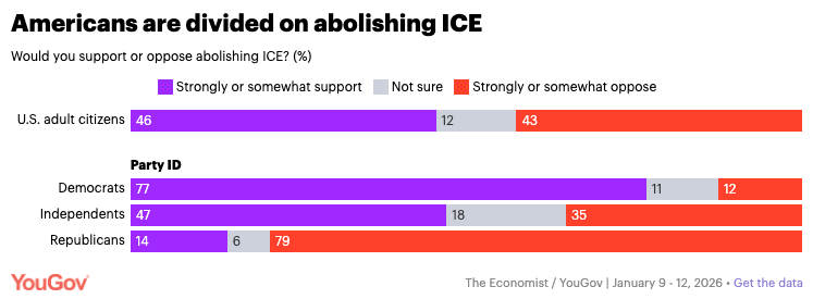 “The topline really understates the intensity of public backlash to ICE and its tactics. In February 2025, just 19% of Americans held a strongly unfavorable view of ICE, per YouGov/The Economist. Today, 40% do. It’s not just that there has been a general move in opinion against the agency. There is a growing and intense, angry opposition to [ICE] across America. — Support for abolishing ICE hits a new high