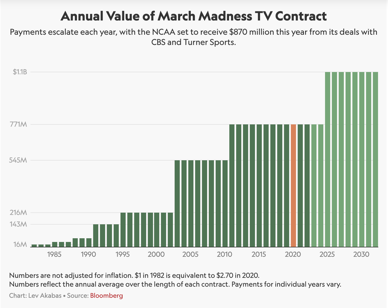 March Madness is, in every sense of the word, a goldmine. University presidents, coaches, business owners, sports books, and TV tycoons rake in millions from the annual tournament. In 2010, the NCAA penned a 14-year, $10.8 billion TV contract with CBS and Turner Broadcasting. In 2016, the deal was extended until 2032 for another $8.8 billion. Between the broadcasting deal and merchandising, the NCAA earns over $1 billion every year, making it the organization’s largest income stream. (The NCAA does not control the College Football Playoffs, Championship, or bowl games.) Approximately 90% of this revenue goes to the participating collegiate conferences and universities, with payouts determined on a rolling six-year performance basis.