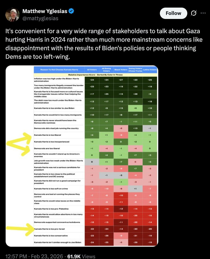 Despite this overwhelming evidence that Zionism is a political loser, Matt Yglesias, who maintained backing Israel’s genocide wasn’t hurting the Biden-Harris administration, is still claiming that Harris lost because she was “too left-wing,” not because she pledged to continue arming Israel. After the Democrats' report leaked, Matt tried to refute it with a single exit poll published a few days after the election from Reid Hoffman’s Blueprint Research, which claims voters didn’t trust Harris because she was “too liberal.” Matt knows very well that the argument that Gaza cost Harris votes doesn’t just include voters who voted for someone other than Harris, but also includes voters who stayed home. So, his entire argument, which runs counter to the Democratic Party’s autopsy report, Harris's 2024 swing-state strategists, even Benjamin Neyenyahu’s favorite newspaper, and Kamala Harris herself, is an incomplete exit poll put out by a billionaire Democratic donor using a methodology that Matt fully knows is a misrepresentation of the question at hand. For all my criticisms of Yglesias, he’s not dumb. He knows full well that he’s lying. He just doesn’t care.