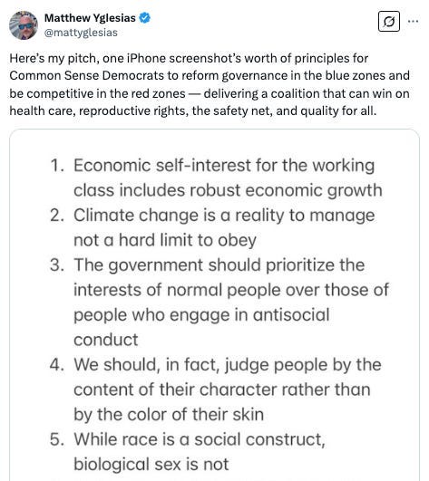 Then, on November 4th, 2024, Yglesias’s entire political theory crumbled before his eyes. Voters chose the right-wing extremist Donald Trump over the centrist moderate Kamala Harris. Scrambling to save face, Yglesias scribbled a post-election “analysis” into his iPhone notes and posted it to Twitter, calling it the principles of Common Sense Democrats. As expected, Yglesias’s babblings blamed progressives and the left for Harris’s loss. It goes without saying that hastily unthought-out points in an iPhone screenshot are not serious political analysis. But that wasn’t Yglesias’s goal. The Common Sense Democrats note wasn’t trying to provide a path to defeating Republican fascism. Its purpose was to give Democratic establishment mouthpieces a framework to set the narrative and push back against the millions of Americans screaming at them for choosing ideological purity over increasing their chance to victory. It was, and remains, a lie; a suplicitious attempt to retcon the truth to protect the finances, stature, and egos of Matt Yglesias and the political establishment he represents.