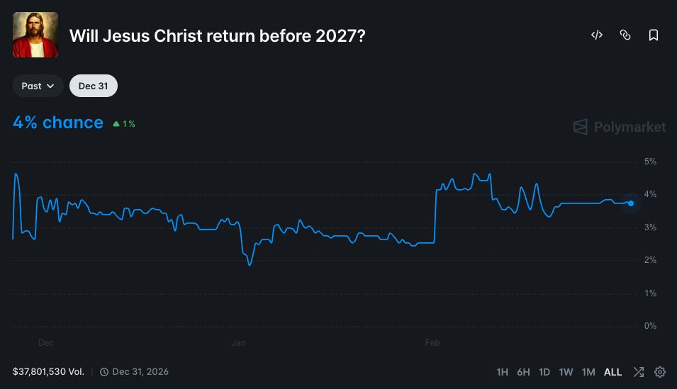 Again, this is not how oddsmaking works. Matt repeats Polymarket’s claim that these markets generate “useful information” by having people bet money on expected outcomes. If we take Matt’s view of Polymarket, this means that there is actually a 4% chance that Jesus Christ returns within the next nine months. If you believe that… yikes.