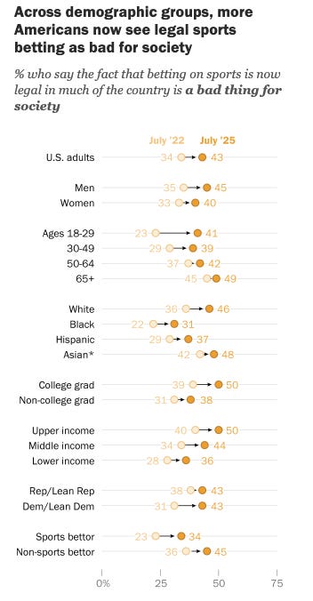 These words were written a few years ago, but the problems Yglesias and the Slow Boring crew were concerned about have only gotten worse, not better. Matt has also been publicly opposed to gambling recently. A few months ago, Yglesias denied Basel Musharbash’s claim that Matt was warming to legalized sports betting, asserting he still thought it should be illegal. And on December 5th, 2025, Yglesias wrote about how the predatory nature of online gambling was making him doubt “free markets more than ever,” saying, “We shouldn’t be organizing our society around getting more people to spend more time gambling.”