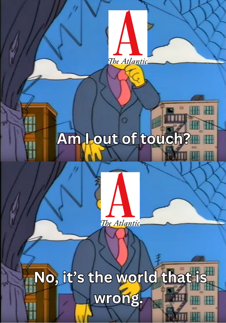 Of all America’s mainstream publications, none fulfills a more pervasive space than The Atlantic. Originally founded as an abolitionist magazine in pre-Civil War Boston, the outlet has long abandoned its commitment to social justice in favor of a more lucrative content strategy. In an age of frustration and desire for political change, especially from the younger generations, The Atlantic exists to assuage the social anxieties of high-income Americans, reassuring them that, despite what young people, workers, minorities, and immigrants say, Everything Is Good, Actually. Perusing the publication’s backlog is like entering the mind of an aging reactionary who can’t move past the Cold War. Each article follows a similar structure. After acknowledging a social fault, be it police brutality or chronic poverty, The Atlantic always returns to conservative talking points: welfare causes poverty, American militarism is a force for global good, and poor people need to pull themselves up by their bootstraps. While its writers acknowledge there are blemishes on the American project, every article concludes with a reminder that America is The Best Government Ever, reassuring the audience that any necessary change can be achieved by politely asking your Senators to make it so.