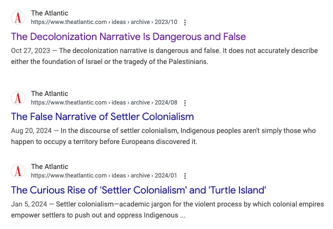 Writing for their predominantly North American audience, The Atlantic has primarily focused on the home front, talking down to anyone who boycotts Israel and aggressively disputing the notion that Israel is a settler colonial state. As you can see below, The Atlantic has taken charge of settler-colonialism head-on, even arguing that those who advocate for the decolonization of Palestine are worse than the “aristocratic sympathizers and peace activists who excused Hitler.”1