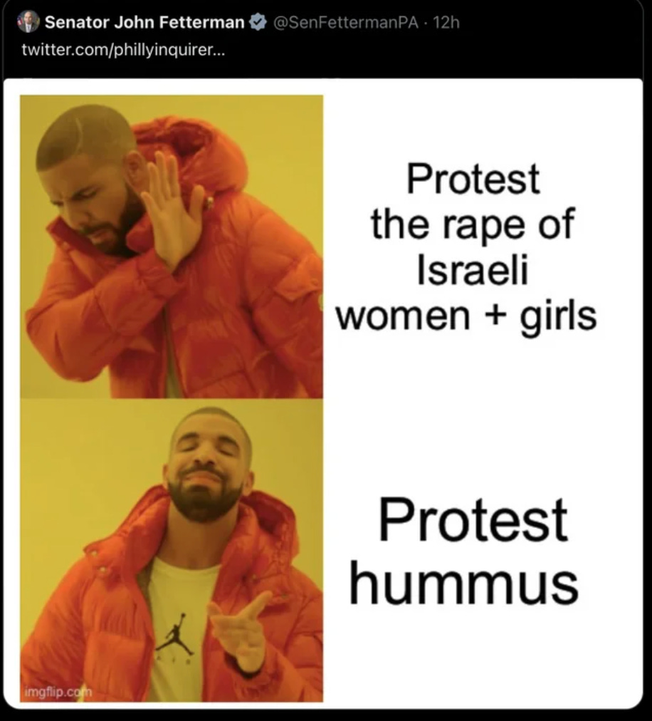 The most troubling aspects of Fetterman’s cognitive state arises around Palestine and Israel. While he’s long been pro-Israel, following the October 7th attacks, the Pennsylvania Senator took his Zionism to a previously unthought level. He shut down calls for a ceasefire, even when the Israeli government began blockading food, water, and electricity from Gaza, a crime under American and international law. Calling his new positions a “gutting betrayal,” former staffers wrote an open letter to Fetterman imploring him to return to his campaign promises.4 Having previously surrendered his Twitter login information to his staff as part of his recovery plan, Fetterman wrestled back his account and posted the below meme. Many politicians are out of step with the public on Israel, but few are openly mocking anti-genocide protestors and making light of sexual assault.