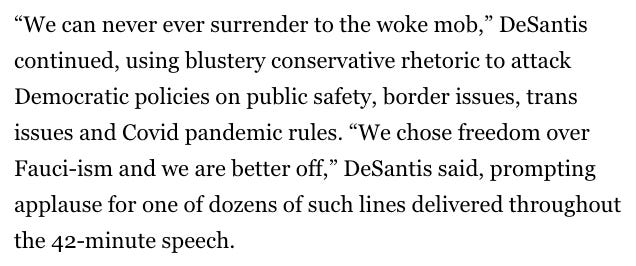When Fetterman’s staff begged him to delete the post, he said didn’t want to “give in to the woke mob.” Paranoia of an unspecified cabal out to get you is both a sign of dementia and a foundational belief of the conservative worldview. It’s terrifying a sitting Senator has succumbed to these delusions. But what’s the difference between John Fetterman’s mania and Ron DeSantis’s political strategy?