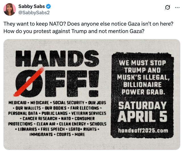But not everyone shared my appreciation. Given Hands Off was planned by groups inside the Democratic coalition (Indivisible, Move On, and the ACLU were core organizers) and included many state Democratic parties and PACs,1 I wasn’t surprised that some leftists were dissatisfied with the event’s character. And their critiques were well-founded. Many elected Democrats who spoke at the protests have shown little resistance to Trump, even voting to confirm his cabinet nominees. Those pursuing the 2028 party nomination were at the forefront, shaking hands and kissing babies to portray themselves as anti-Trump leaders. It’s more than fair to criticize those who speak against fascism before a crowd but bow to it inside the congressional chambers. The espoused goals of the protest were also off-putting to the left. The organizers omitted Palestine from their list of issues but celebrated NATO, the exact opposite of an anti-imperialist foreign policy the political left aims to build.
