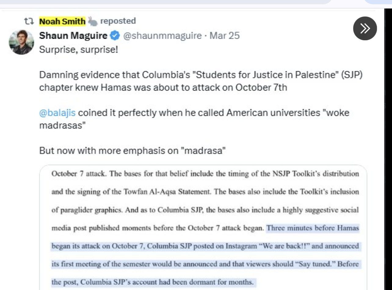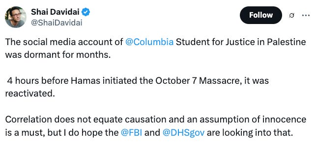 , a popular liberal Substacker, has lost his mind trying to explain that campus protestors who challenge his worldview (and elitist ego) are actually terrorists who deserve everything Trump is doing. He’s currently claiming the Columbia chapter of Students for Justice in Palestine had prior knowledge of the October 7th attack, which would mean Hamas’ leadership risked leaking their plans so college kids could get a head start on their Instagram posts.I fully agree that to stop the genocide of Palestine, it’s going to take a big tent coalition. Many of those members will be liberal Zionists, who might unite with us anti-apartheid activists, but will always claim it’s not actually apartheid. While I welcome anyone’s support in calling for an end to the bombings, displacements, and massacres, liberal Zionists must reckon with their actions. Not just to thwart Trump’s transgressions here in America, but to deny the Israeli regime the propaganda it needs to fulfill its long-stated goal of dispatched Palestinians, one way or another.