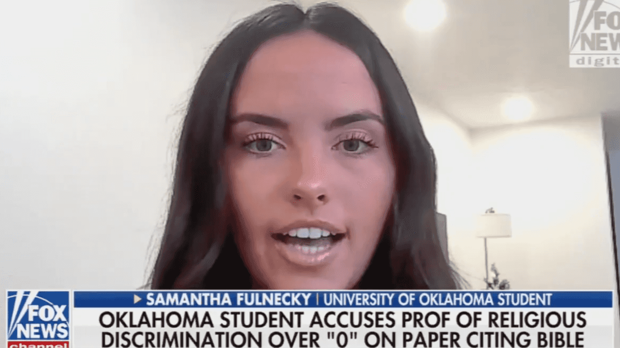 But to top the entire saga off, during an interview, Fulnecky undercut the entire conservative argument that she was persecuted for making a Christian argument by admitting that she never read the actual assignment and had written the paper in thirty minutes. This was the low-quality effort the TA failed her for, which conservative hype machine claimed was “religious persecution.” Doing that is only something an idiot would do. But admitting it on camera leads me to believe the 400 Botox injections Fulnecky shot into that glacier of a forehead are cutting off the blood flow to her brain. It can not be possible for someone to naturally be this dumb. And I must repeat — the Oklahoma Republican Party elevated this woman and gave her an award. This is their idol!