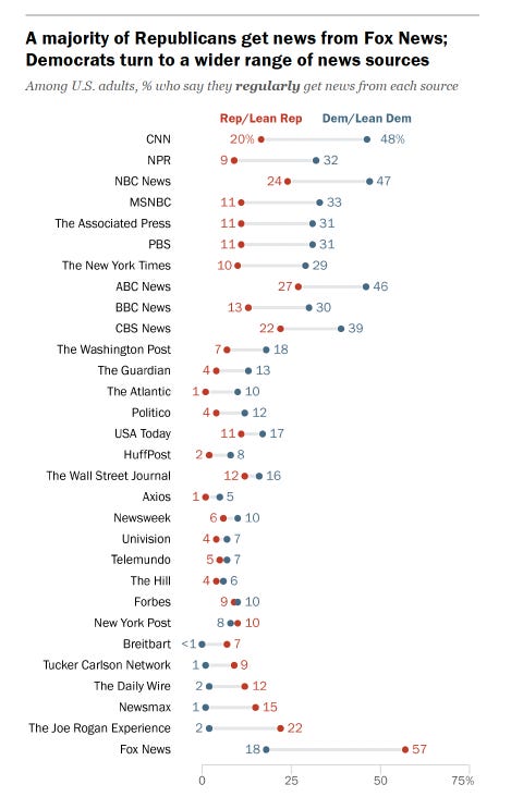 With the typical conservative celebrity having less brain function than a coma patient, it’s no wonder the right-wing population has no interest in actual intellectualism or political theory. They want slop. Conspiracy-brained, insane, racist slop. The sloppier the better. This irritates many members of the right-wing elite, who fancy themselves to be the free-thinking, open-minded intellectual titans that they spent the Trump era trying to brand themselves as. No one embodies this frustration more than Christopher F. Rufo a self-styled conservative intellectual, whose diatribes against critical race theory are now considered dull and boring by the rage-seeking conservative masses. Rufo has recently taken to complaining that there are no true conservative writers here on Substack, with the lone exception of himself. Yea man, conservatives don’t read. I’m not being rude. They literally just don’t read. According to Pew Research, the only media sources that get more Republican audiences than Democrats are the slop factories filling the endless slop trough that is the rightist internet: Breitbart, Tucker Carlson, The Daily Wire, Newsmax, Joe Rogan, Fox News, and The New York Post. But even The Post, which is just right-wing tabloid rage bait, only gets slightly more Republican readers than Democrats (10%-8%). Sorry Chris. Conservatives don’t read. You’d have better luck selling Kristi Noem a puppy. And they don’t watch the news, unless it’s Sean Hannity or another drunk slob yelling at the TV until he’s red in the face. This is one of many reasons why Bari Weiss’s CBS project is failing. Conservatives want slop.