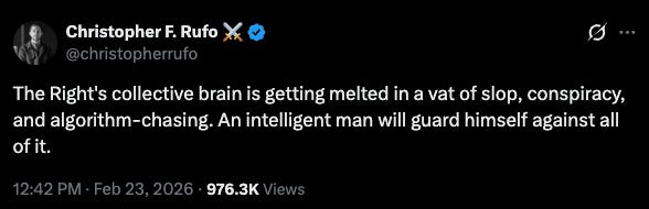 Just like Ben Shapiro, what makes Rufo such a pathetic crybaby is that he is personally responsible for the degradation of the conservative mind. To give you a taste of the high-brow, in-depth political thought he brings to the political arena, I suggest you read his 2024 article, The Cat Eaters of Ohio. I’ll say this: it’s the most thought-provoking argument in support of Trump’s campaign claim that Haitian immigrants were eating pets in Springfield, Ohio. That is to say, it’s absolute dribble. But it’s spell-checked dribble, and for conservative media, that’s a high bar. Now that all the right-wingers are getting conspiracy-pilled by the likes of Nick Fuentes and Candace Owens, Rufo is trying to pull them back by saying “intelligent men” guard against “slop, conspiracy, and algorithm-chasing.” This is true. Intelligent people do protect themselves from nonsense. But thanks to Rufo’s work chasing algorithmic success with slop and conspiracies, there are few intelligent men or women left in the American conservative movement. And Rufo has no one to blame but himself.