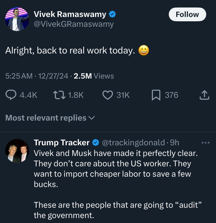 While Trump and his ilk literally hug the American flag, the truth is they don’t really give a shit about America or any of its inhabitants. Despite being the most xenophobic person in politics, Donald Trump has a long history of hiring low-cost, undocumented workers. That’s because Donald Trump is a capitalist. He cares about nothing besides profit and his self-image. He even buried the mother of his children on a golf course to get a tax break. While Trump is more brazen about his addiction to profit, it’s a sentiment shared by every member of the capitalist ruling class. Vivek, Elon, and every other Trump-supporting business person like H-1B visas because they supply an easily exploitable workforce. Because visa workers must stay at their supporting company to keep their visas and remain in the country, they are much less likely to rock the company boat by unionizing or taking any collective action that threatens the profit line.