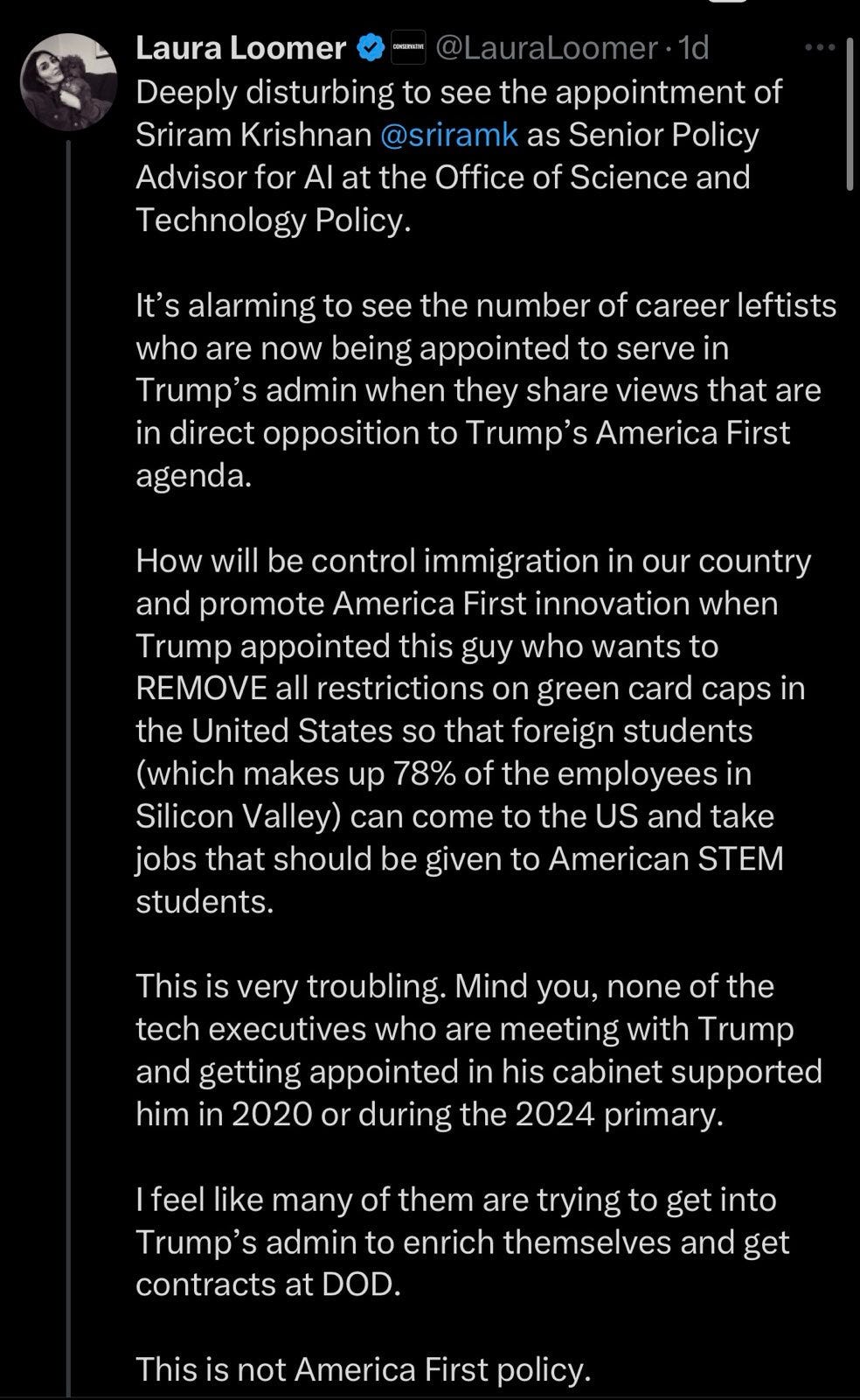 It all started when Trump appointed Sriram Krishnan as his senior advisor on artificial intelligence. A few longtime Trump believers, including Laura Loomer, took issue with the appointment for two reasons: