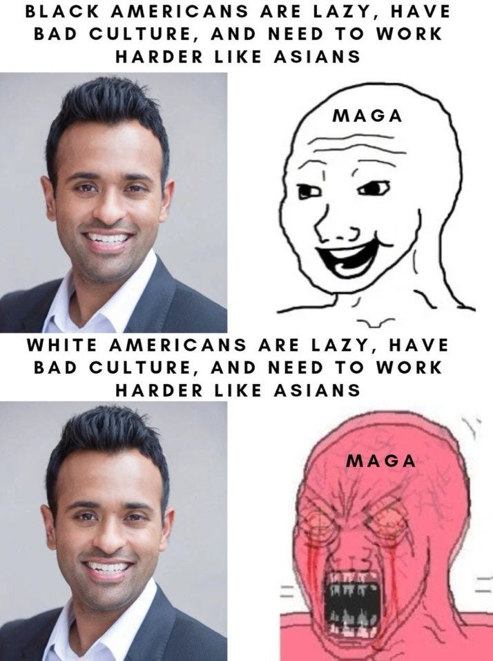 Essentially, Vivek talked about White Americans the way the GOP talks about Black Americans, calling their culture misguided and lazy, incorrectly worshiping celebrity and leisure instead of academic success. In his words, “A culture that celebrates the prom queen over the math olympiad champ, or the jock over the valedictorian, will not produce the best engineers.” Unsurprisingly, many Trump supporters took issue with Vivek’s words.