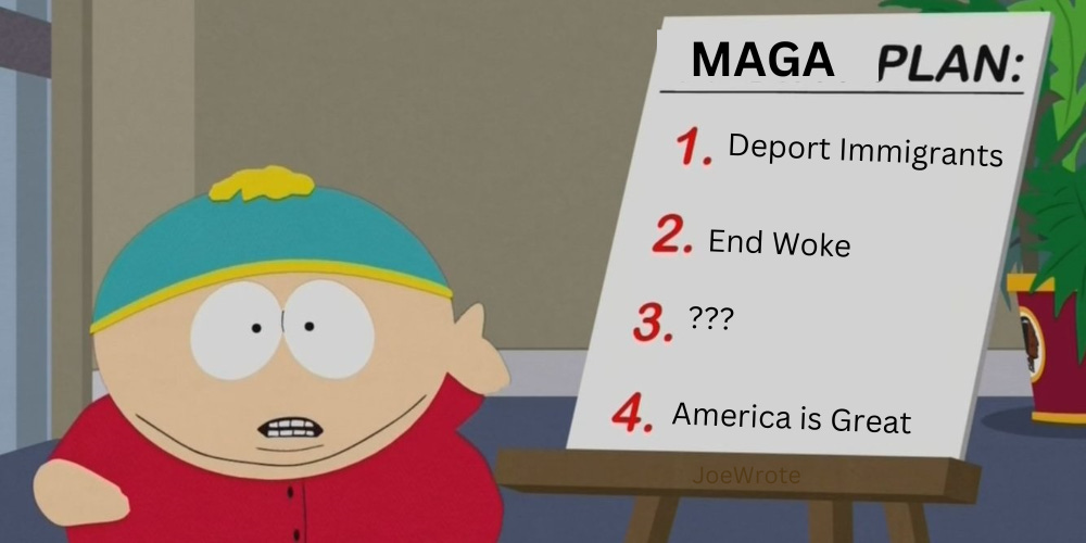 Point #1 courts the rich and powerful to the Republican coalition, while Point #2 attracts enough working-class support to get the campaign across the finish line. Much like Democrats’ use of say-a-lot-do-little identity politics that pays tribute to social and political progress without delivering change for marginalized Americans, nationalism does nothing for Republican voters. It is, from top to bottom, the politics of vibes. Attached to the vibes are loose policy proposals, such as Trump’s claim that deporting undocumented immigrants will lower healthcare costs. After listening to the reactionary rhetoric of someone like Ronald Reagan, George W. Bush, or Donald Trump, they’re ready to Make America Great Again, which they believe is a synonym for “make my life easier.” As their thought process goes, “Once we deport the illegals, the Woke Mob, and the women who won’t sleep with me, America will prosper, and I’ll magically get a raise.”