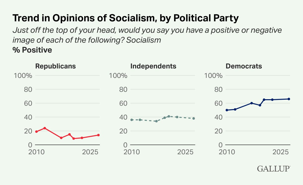 Outside of the electoral arena, the left has gained considerable ground. Last week, the Democratic Socialists of America crossed 86,000 members, making it the largest anti-Zionist organization in the country. The Party for Socialism and Liberation announced a slate of candidates following Mamdani’s win, marking a notable turn towards mass electoralism in the party’s strategy. These developments are natural occurrences of the left’s growing political presence. 66% of registered Democrats have a favorable view of socialism, while the favorability of capitalism has fallen to 42%. It’s no surprise that a national poll found 53% of Democratic voters prefer politicians described as “similar to Bernie Sanders, Alexandria Ocasio-Cortez, and Zohran Mamdani,” while 33% favored those “similar to Chuck Schumer, Hakeem Jeffries, and Nancy Pelosi.” Independents remain unmoved on socialism (polling between 41% and 38% over the last five years), but their favorability of capitalism has fallen from 57% to 51%. Clearly, support for socialism hasn’t overcome the last century of anti-communist propaganda, purges, assassinations, and counter-intelligence programs. But the decreasing favorability of capitalist reality indicates the left has room to grow. When I was younger, every politician bragged about “running the government like a business.” You don’t hear that much anymore, for good reason. Favorability of big business has nosedived since its peak in 2012, falling from 58% to 37%.16