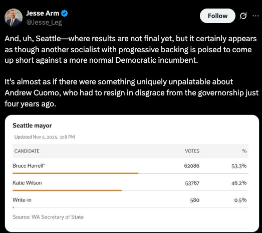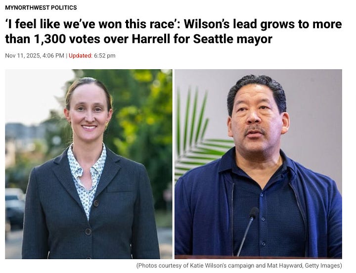 On election night, it appeared progressive challenger Katie Wilson had lost the Seattle mayor’s race to incumbent Bruce Harrell, a more traditional Democrat. Many establishment voices pointed to Seattle as proof that leftist politics were unfeasible and that Mamdani’s win was an outlier. Well, I hope they enjoyed that narrative while it lasted. As the final votes have been counted, Katie Wilson’s victory looks all but certain.