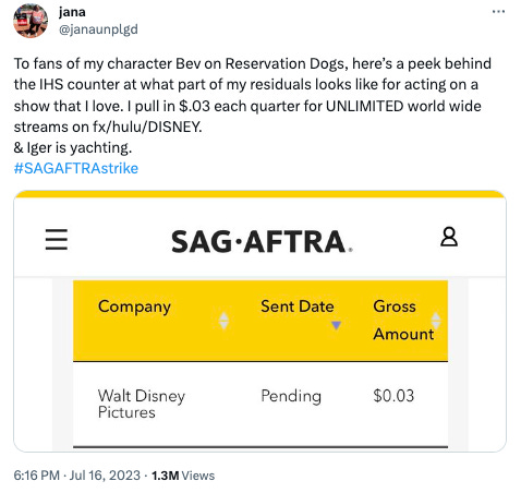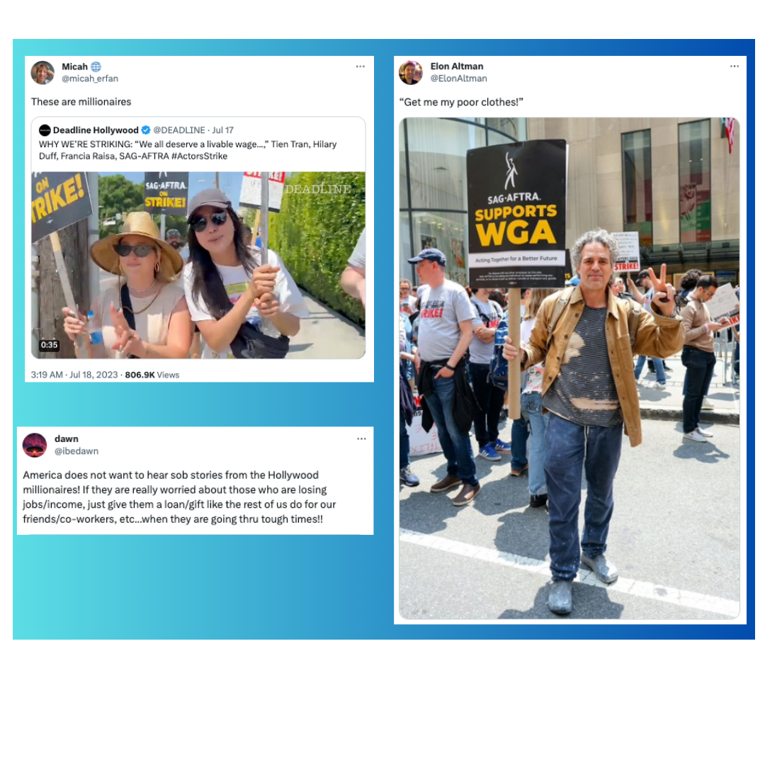 Last week, the Screen Actors Guild-American Federation of Television and Radio Artists (SAG-AFTRA), the union representing TV and movie actors, announced they would be going on strike. Not long after the announcement, some of the most famous celebrities in the world joined the Writer’s Guide of America (WGA) on picket lines outside of Hollywood’s iconic production studios. As actors are highly visible, often famous, and assumed to be highly paid, many commentators derided SAG-AFTRA as nothing but a group of greedy millionaires seeking more money and attention. A few of these very-poor takes can be seen below.
