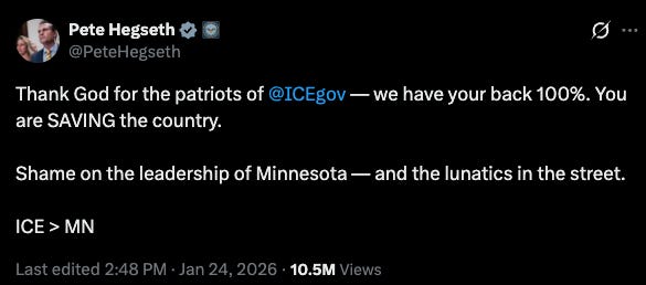 The answer is simple. Trump, or rather Stephen Miller, who is de facto president at this point, is punishing Minnesota because it is an affront to their White ethno-nationalist project. On paper, Minnesota ‘should’ be a Trump state. More rural and more White than the national average, and surrounded by states that voted Republican in 2024, Trump thinks Minnesota should enthusiastically support him. He repeatedly claims he’s “won Minnesota three times,” despite it not casting its electoral college votes for a Republican in over half a century. By defying the conservative worldview of native-born White Americans pitted against foreign-born or minority Americans, Minnesotans threaten the Republican project. Not just with their whistles and patrols, but with their multiculturalism. In 2020, Minneapolis rose valiantly to oppose state violence against Black Americans, setting off a wave of Black Lives Matter protests across the country. Conservatives wanted Trump to send the military into Minneapolis and crush the civil rights protest with a heavy hand. But he didn’t, and they failed like they missed their opportunity to punish progressive Americans for daring to live in the 21st century. That resentment undoubtedly played a large role in the decision to concentrate ICE in Minneapolis, as revenge for imagined transgressions is the engine of American conservatism. The right’s “Us vs. Them” mantra is so pervasive and psychotic that the Minneapolis-born Secretary of Defense or War or Whatever has no problem publicly stating that ICE is greater than his home state.